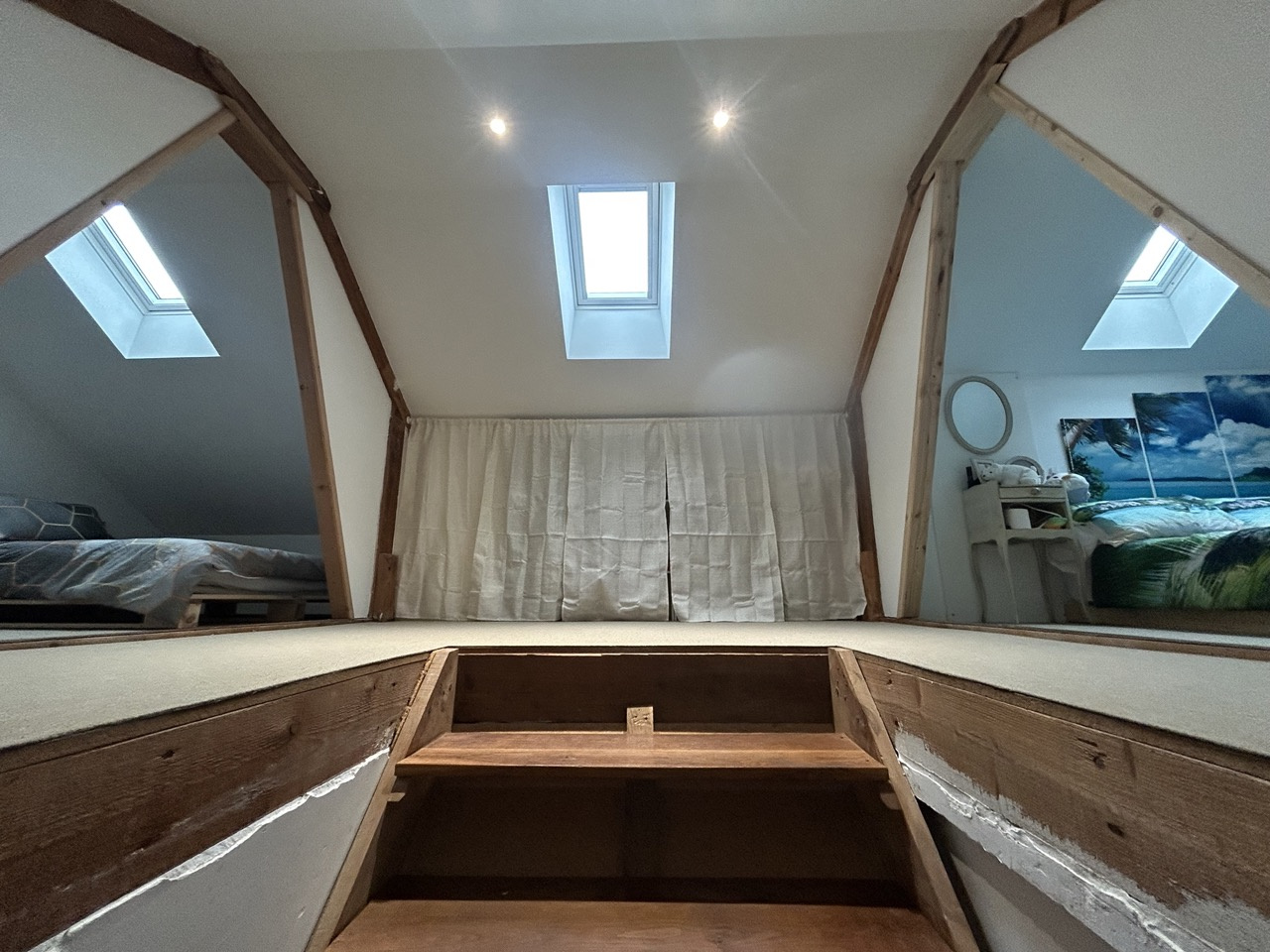 Les combles aménagés disposent d’un palier desservant deux chambres supplémentaires, idéales pour une famille ou un espace indépendant.