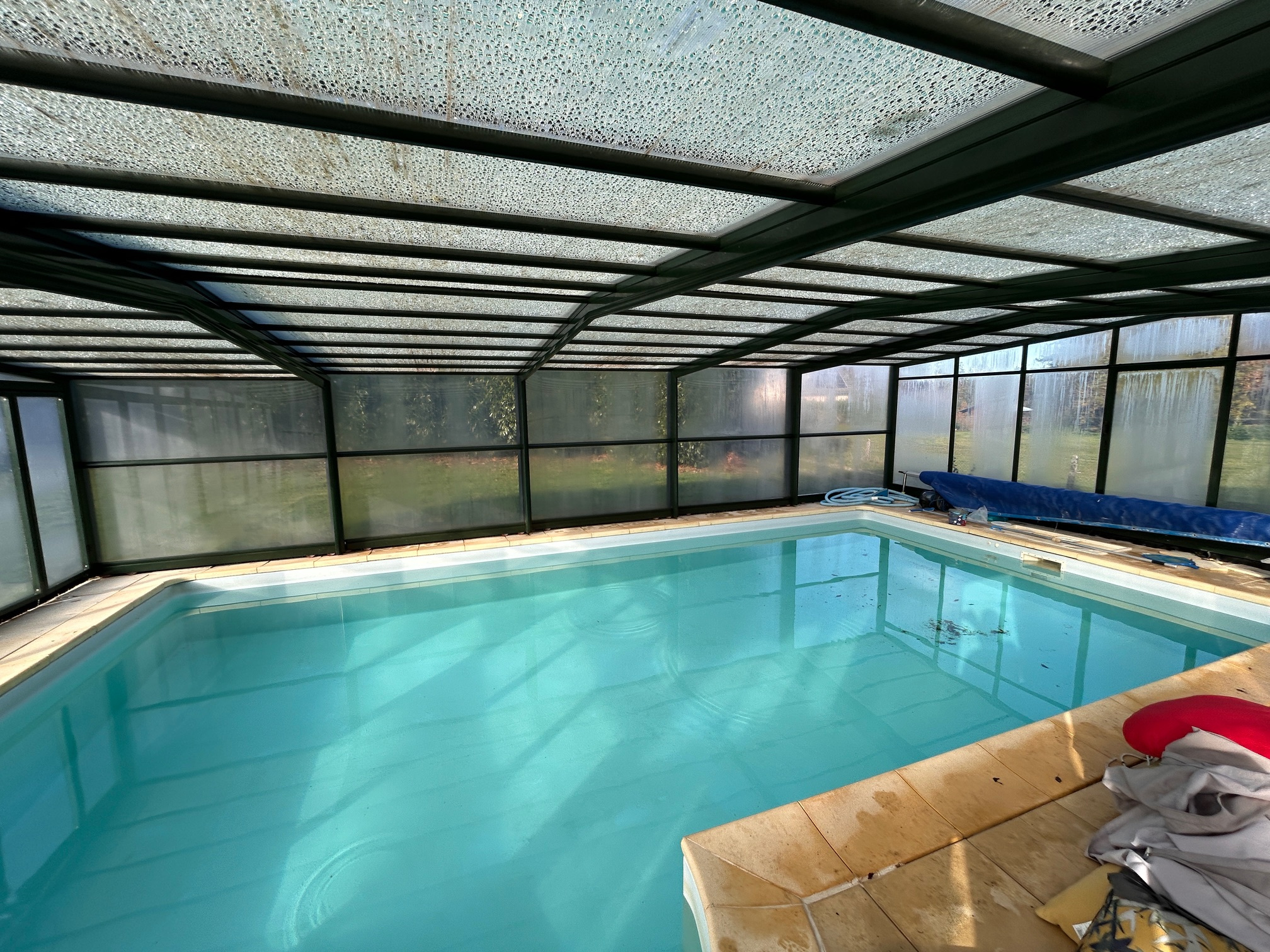 L'extérieur possède une piscine entièrement couverte par un dôme, une terrasse de 30 m2, et deux terrasses couvertes, un garage non-attenant et un hangar fermé de plus de 220 m2. Le tout sur un terrain d'environ 3600 m2 clos.